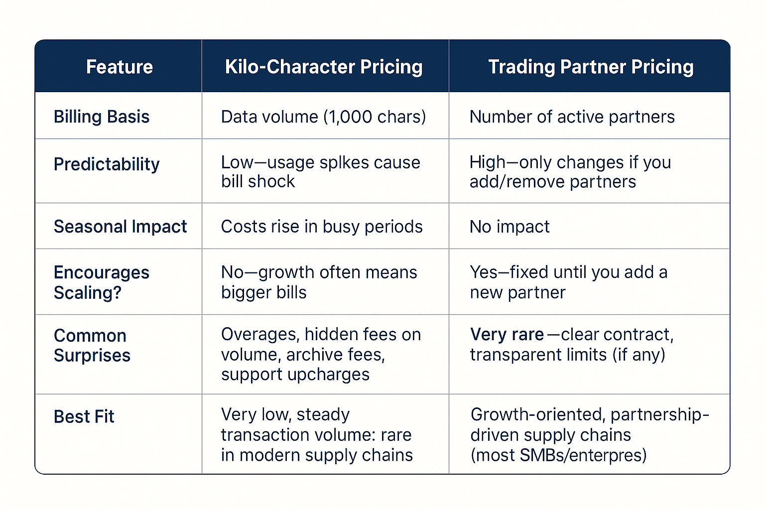Ultimately, the choice comes down to transparency, predictability, and alignment with your business goals. For manufacturers, distributors, and B2B supply chains looking to grow, kilo-character pricing acts as a hidden tax on success—each improvement in digital process or richer data can cost you, rather than reward you. Trading Partner Pricing, in contrast, supports growth: you know when your bill will change, it happens only when you win new business or form new relationships, and you can budget effectively for the long haul.